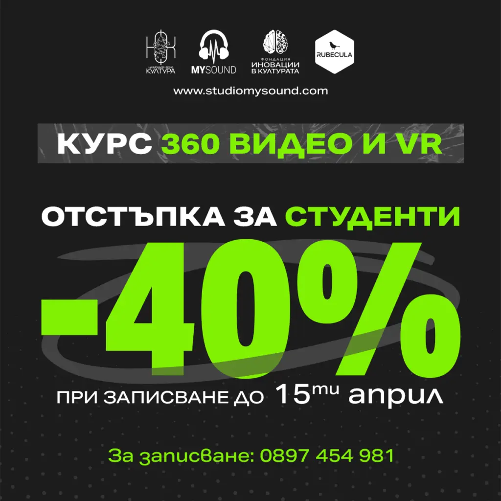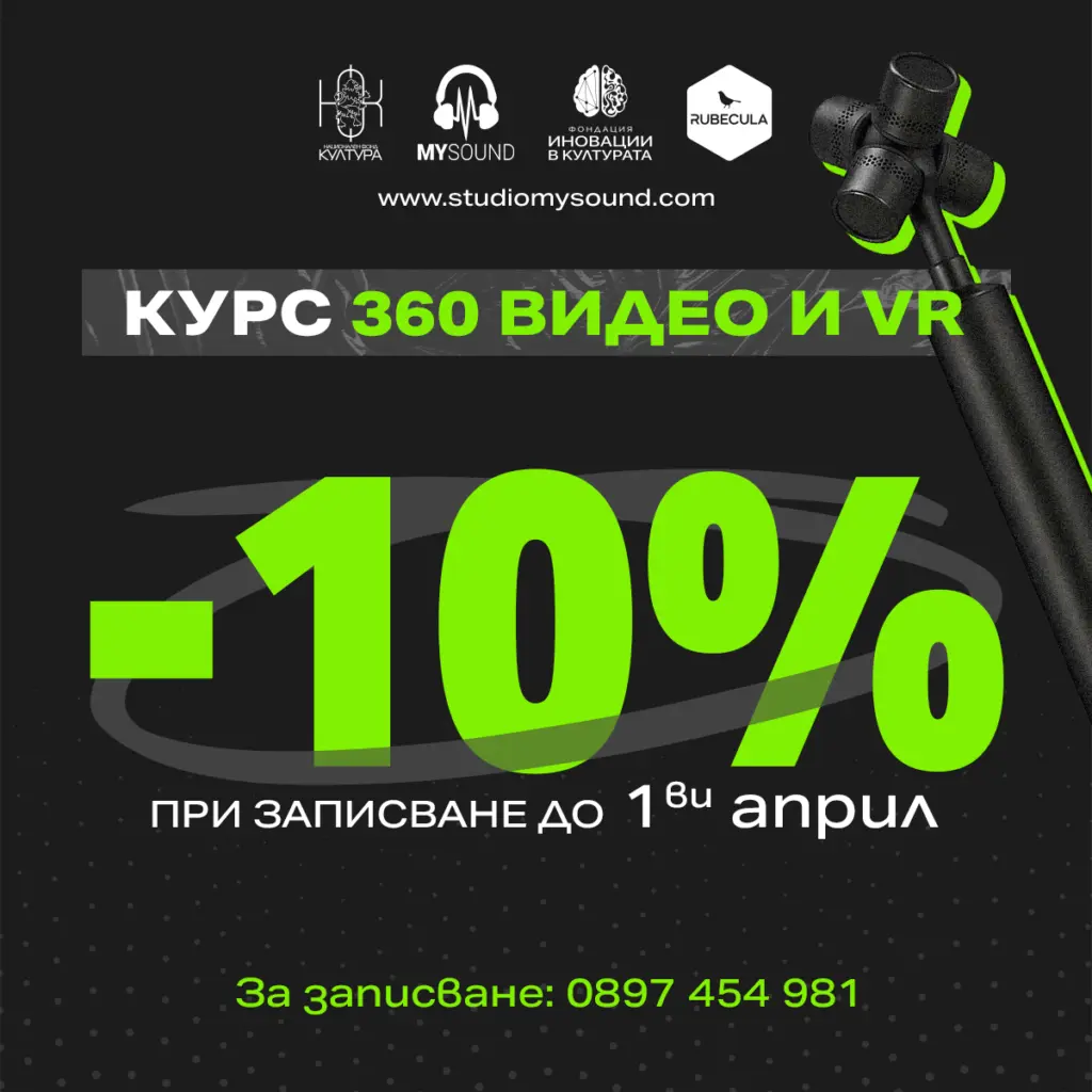 От 3 юни до 8 юли ще се проведе курс по 360 Видео и Виртуална реалност (VR) В рамките на курса ще се запознаете с най-новите технологии, ще се научите да снимате и монтирате 360-градусови видеа, ще се запозанете с различни технически и творчески похвати при работа с 360 и виртуална реалност и ще имате възможност да работите върху ваш творчески проект под менторството на професионалисти от сферата. Курсът ще даде основни познания по: